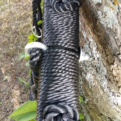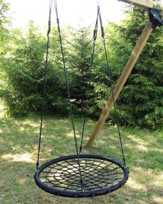 Tugev võrksisuga pesakiik. Pesakiige terasest raam on ühes tükis ning poltühendused kinnituvad läbi meetrise läbimõõduga rõnga.